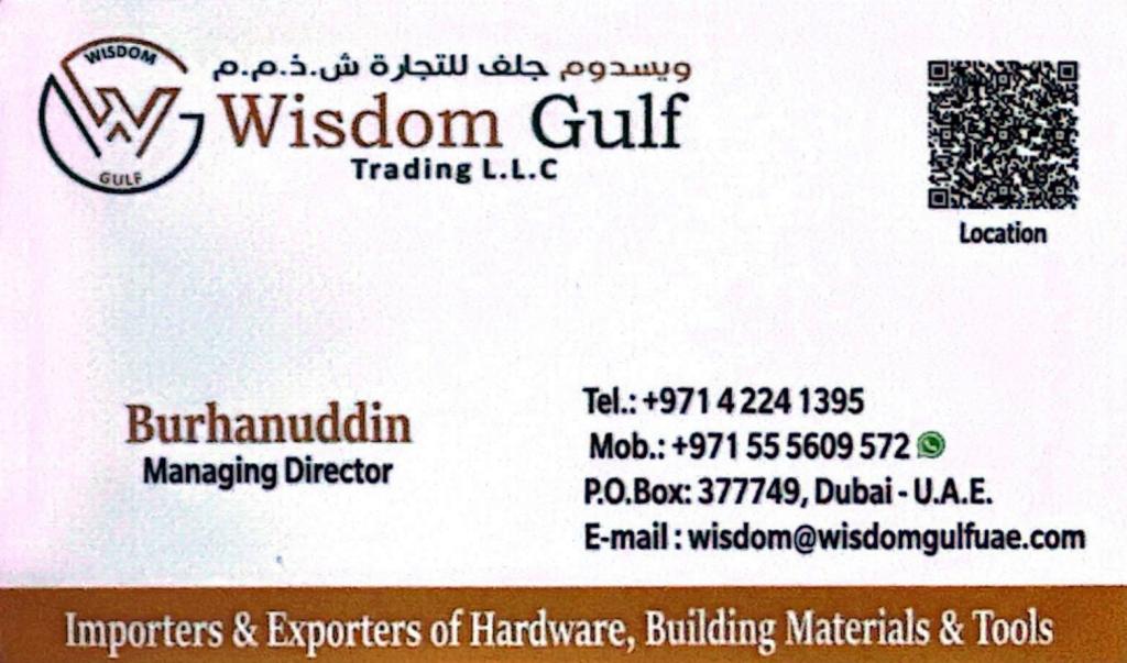 INDENTOR, IMPORTER & EXPOTER OF HARDWARE & BUILDING MATERIALS. Stockists of Fasteners ,Rigging Hardware, Tarpaulins and Ropes. Address Dubai, United Arab Emirates Email wisdom@wisdomgulfuae.com Phone 971555609572 971552398752 97165572458 Photos Category General Hardware Keywords Hardware & Building Materials Ad Type 1 Year